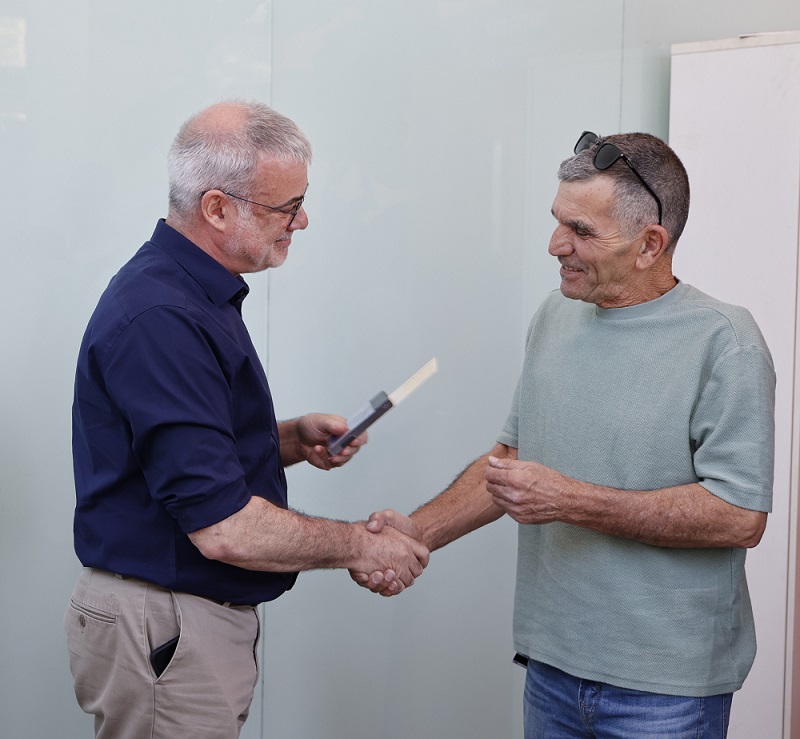 בתמונה: פרופ' שפרכר מעניק אות הוקרה לאלי סרדס – מנהל אחזקת מבנים.