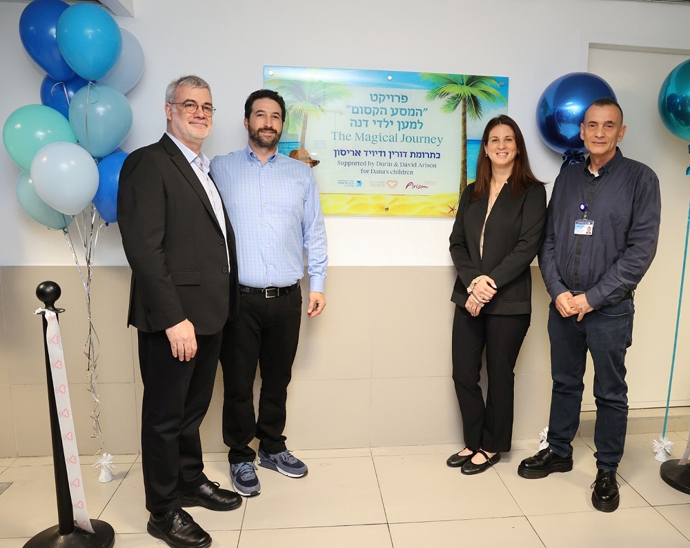 מימין לשמאל: פרופ' דרור מנדל, מנהל בית החולים לילדים "דנה דואק", דורין ודיויד אריסון, פרופ' אלי שפרכר, מנכ"ל המרכז הרפואי איכילוב. צילום: מירי גטניו