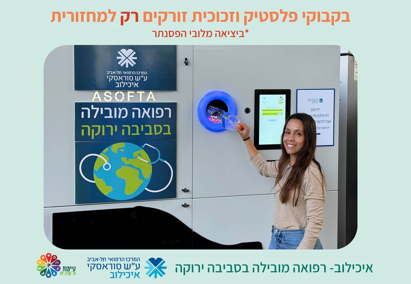 כחלק ממדיניות הקיימות של בית החולים, בנוסף לפחי המחזור ברחבי בית החולים, הצטיידנו במכונת מחזור חכמה, הממוקמת ברחבה מחוץ ללובי הפסנתר. ההכנסות ממחזור הבקבוקים יוקצו לטובת פעילות קיימות.