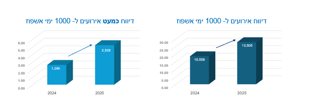 בשנת 2026 נמשיך להציב מדדי דיווח ותחקור: 4 דיווחי כמעט אירוע לחודש ו- 6 תחקירים פנימיים בשנה. יחד נחזק את תהליכי הלמידה והאחריות במחלקות, בשגרה, וביום-יום.